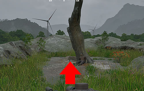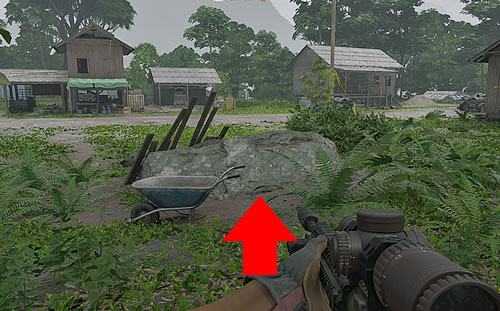 場所:「プーサイ村」の南、材木が掛かった岩の後ろにある一輪車の横