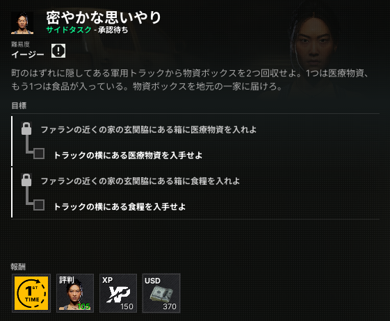 1.「人里離れた民家」と道路の間の森に隠されてるトラックの後方に積まれてる箱2つを拾う。箱はそれぞれ届ける場所が決まってるのでいっぺんに2つ拾う方が間違いがなくて良い。