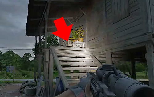 2.「人里離れた農家」の高床式住居の入口にある「白いカゴ」を調べて「UNLRA医療物資」を入れる。