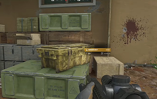 2.その建物の右側の外に積まれている箱を調べ、「GPS追跡装置」を隠す。