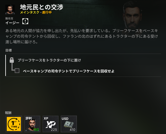 1.ベースキャンプの司令テント内のテーブル上にある「ブリーフケース」を取る。大きさ2×2マスで重さは5キロ。