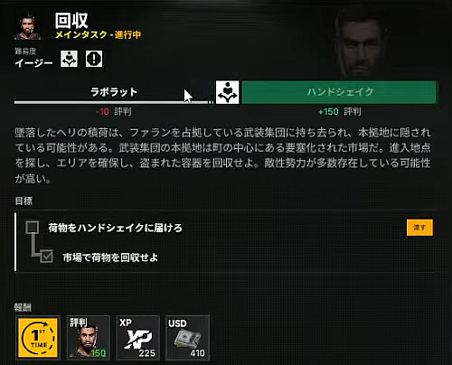 選択タスク:ハンドシェイクに渡すと「ラボラットのタスク・隠密調査」が失敗となる。