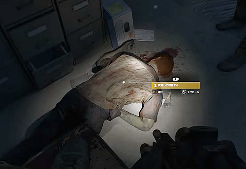 指定エリアの倉庫内の事務所の中で倒れてる死体を調べる。