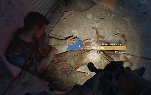 3.「ガレージ」の前で倒れてる死体の脇に落ちてる「ガレージの避難リスト」を読む