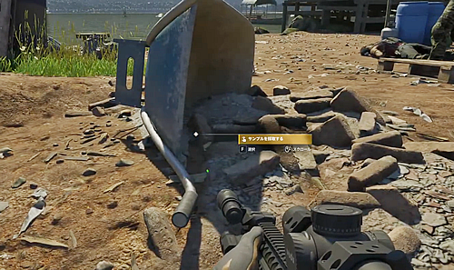 4.バンパの海沿いで倒れてる一輪車あたりの土を調べてサンプルを入手する