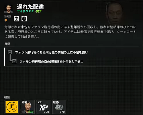 3.隣の格納庫の青い飛行機の前方車輪あたりに箱を置く。格納庫に入るには「格納庫03の鍵」が必要。鍵は同エリアの敵の荷物から拾えるか、ターミナルのどこかに置いてあるかもしれない。
