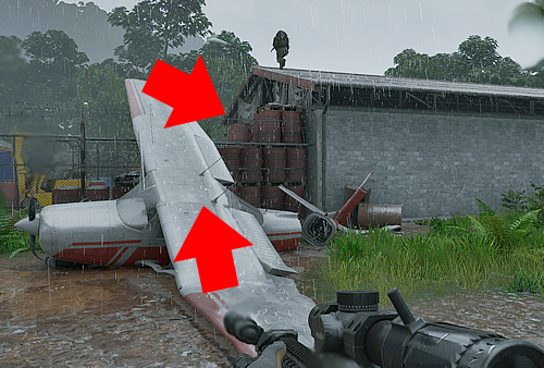 2.「人里離れた格納庫」の裏で倒れてる飛行機の翼から登っていき、ドラム缶をつたって格納庫内に侵入する