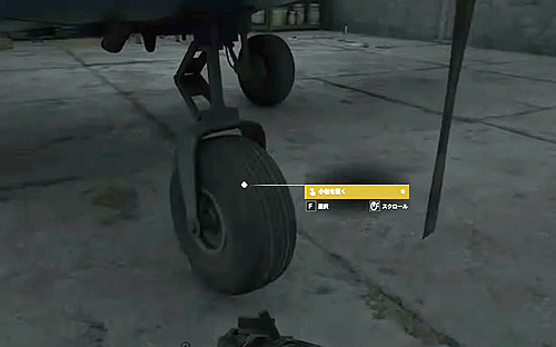 隣の格納庫の飛行機の車輪に置く。なぜか車輪に置く