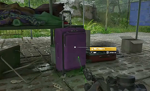 1.「飛行場チェックポイント」のテント内にある紫色のキャリーケースを調べる