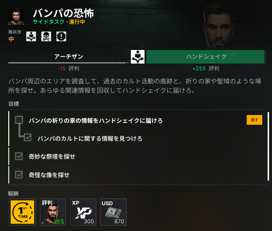 選択タスク:ハンドシェイクに渡すと「アーチザン・ピーパーマムの呼び声」が失敗となる。