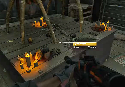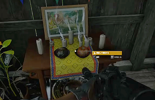 1.「ボロボロの家」の中のローソクがある祭壇を調べる
