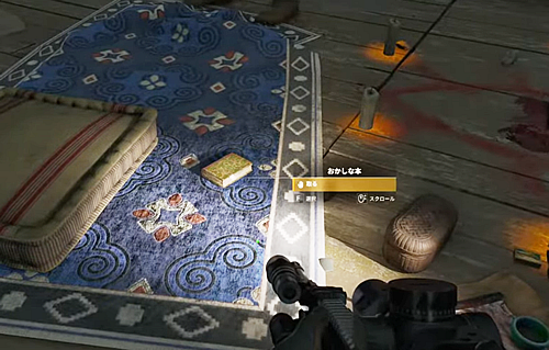 3.「祈りの家」の2階の外の屋根の隙間をジャンプで越え、2階の部屋に入り、床に置かれてる「おかしな本」を取る
