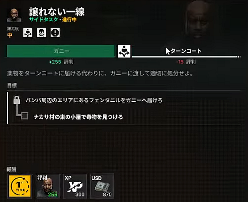 選択タスク:ガニーに渡すと「ターンコート・分かち合いの価値」が失敗となる。