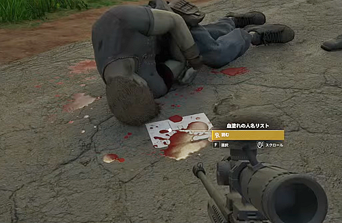 1.当該エリアの道路上に倒れてる死体の脇に「血ぞめの人名リスト」が落ちてるので読む