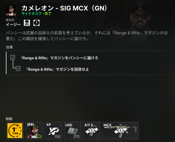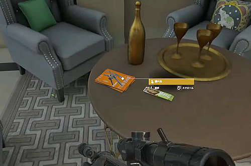1.ミッドナイト・サファイアホテルの受付フロントと同じ階層、エントランスから入って受付フロント過ぎたら右に曲がってすぐまた左に曲がったところにある丸テーブルの上にある、武器雑誌「Range&Rifle」を調べて受注し、雑誌を拾う