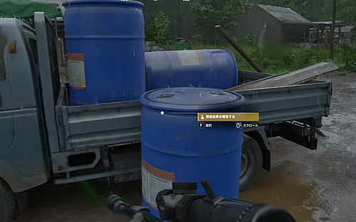 1.道路に停まってる軽トラの所にある青いドラム缶を調べる