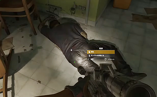 2.中央あたりの建物の1階で倒れてる死体を調べてサンプルを回収する