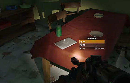 3.北側の建物の1階のテーブル上にある「農家の日記」を取る