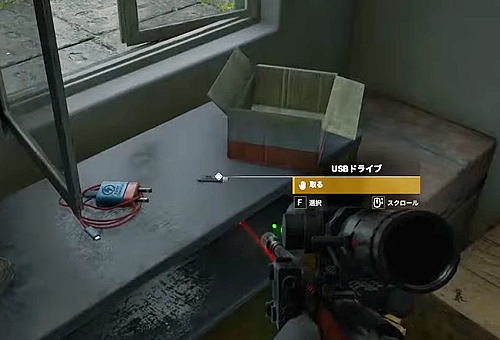 2.「管制塔」と「地下武器庫」の間にある建物の中の棚上にある「USBドライブ」を取る。