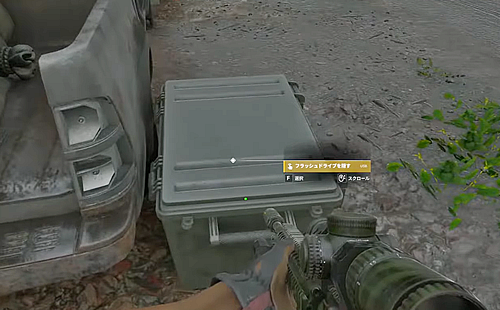 3.「飛行場裏口」のすぐ外にある車の脇のコンテナを調べてUSBドライブを入れる。