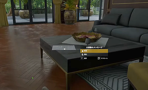 6.同じ4階、ウォークインクローゼットの隣にある部屋のテーブルの上にある書類「大使館のメッセージ」を取る。