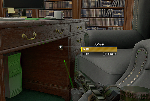 4.再びホテルに行き、4階の中央にある偉い人の大部屋、その机の内側に「スイッチ」があるのでそれを押す。すると本棚が動いて隠し部屋が開く。