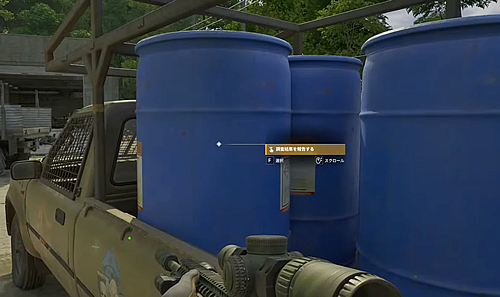 1.「コンタブ倉庫」の屋外で、青いドラム缶を積んだ車両のドラム缶を調べる。