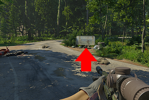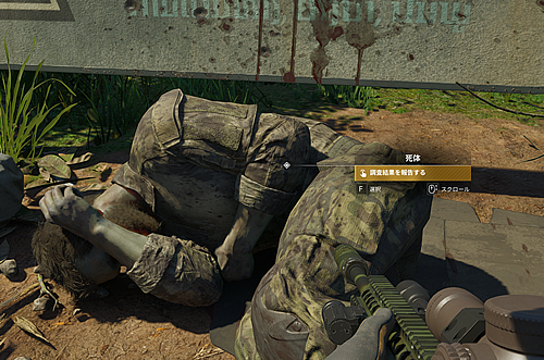 橋近くの道沿いにある看板の下で倒れてる死体を調べる。