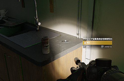 なお建物に入るには「ミッドナイト・サファイア従業員用住宅事務所の鍵」が必要。鍵は同エリアの敵の荷物から拾うか、向かいの建物のキッチンの流しの横にに置いてあるかもしれない。