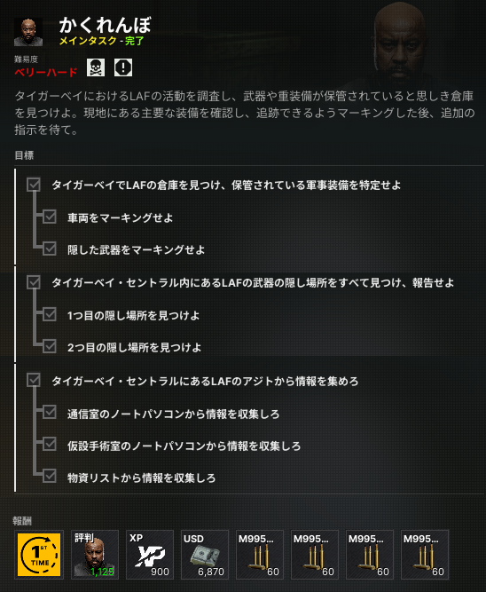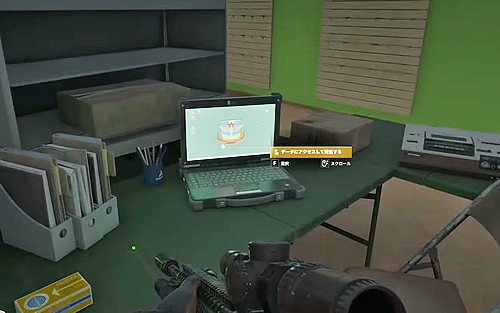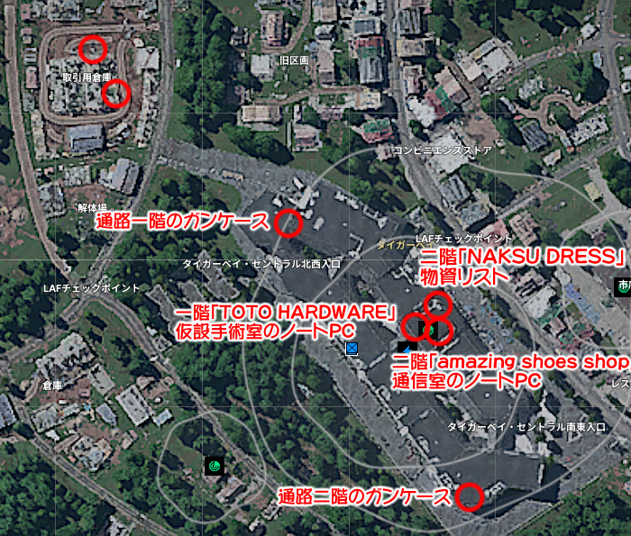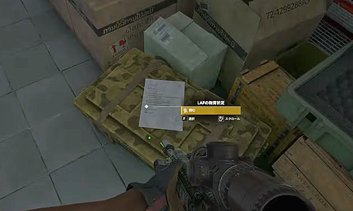 ・中央渡り廊下の東側、2階「NAKSU DRESS」に入って正面の部屋が武器庫となっており、鍵を開けて中に入り中央のボックス上にある書類「LAFの物資状況」を読む。