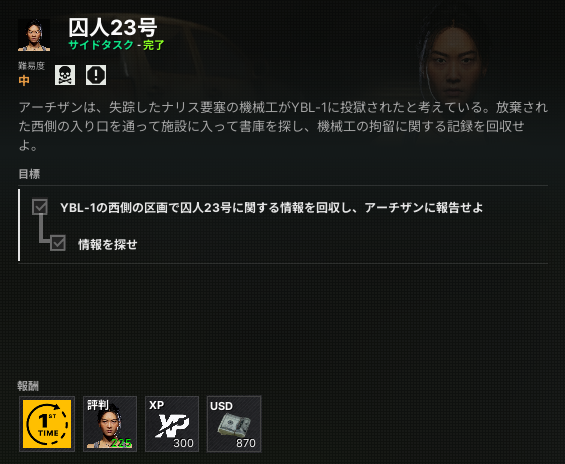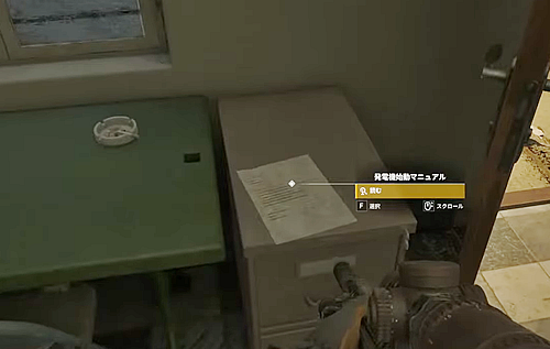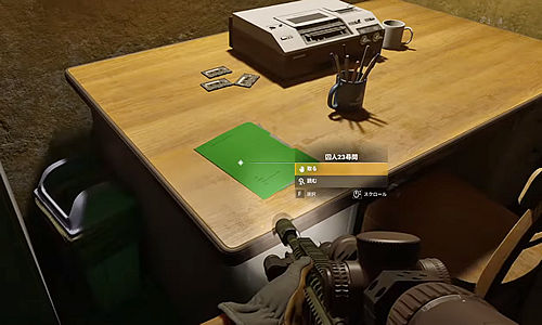 2.地下を進んでいくと、「OFFICE」と書かれた部屋があるのでそこに入り、中の机の上にある緑色フォルダ「囚人23尋問」を取る。