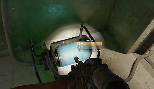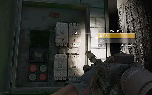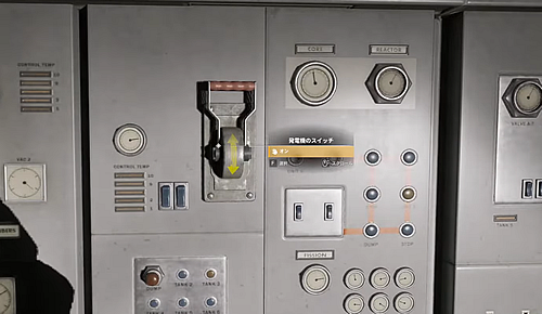 手順は、まず建物内の奥部屋の壁にある「発電機のスイッチ」をオンにし、次に外壁にある「ブレーカー」の4つを順番通りにスイッチを入れていき、そのあとに足元にある「水ポンプ」をオンにする。10秒ほど待つと水が引き、扉を開けて地下に入ることができるようになる。