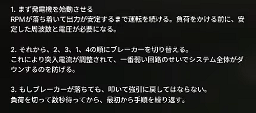 なお操作手順は手前の事務所建物の中に「発電機始動マニュアル」がある。