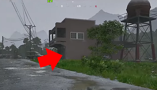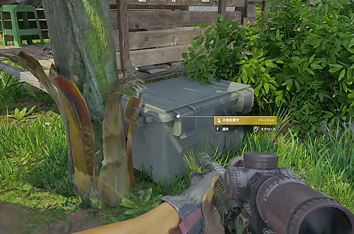 2.田んぼの真ん中にある「孤立した避難所」の小屋脇にあるコンテナを調べてブリーフケースを入れる。