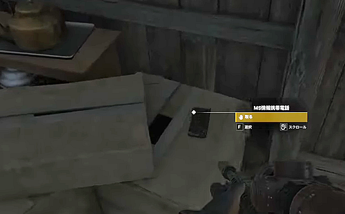 2.そのチュオン村の、大きな高床式住居の中に入り、箱かテーブルの上にあるスマホ「MS情報携帯電話」を取る。