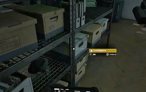 1.「本部」の入口から入って左側の奥、鍵が掛かった書庫に入り、棚にたくさんある書類箱をいくつか調べることができるのでどこかに入ってる「フォルダ00616」を探して見付けたら取る。