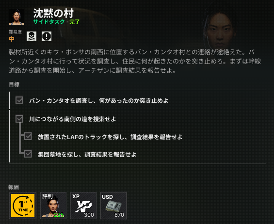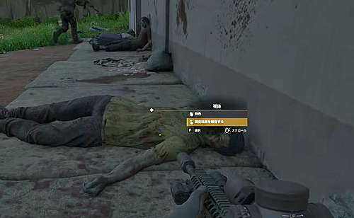 1.「バン・カンタオ」の道路沿いの大きい建物の横の外壁で倒れてる死体のどちらかを調べる。