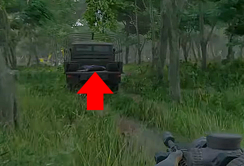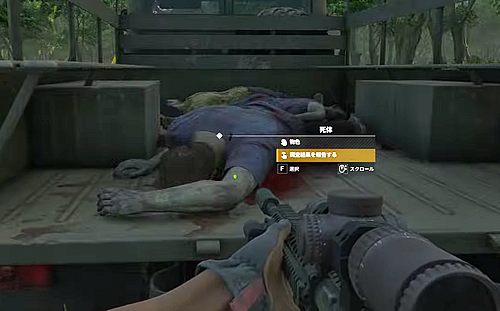 2.今の建物の南に、森へと続く道がありその途中のトラックの荷台の死体を調べる。