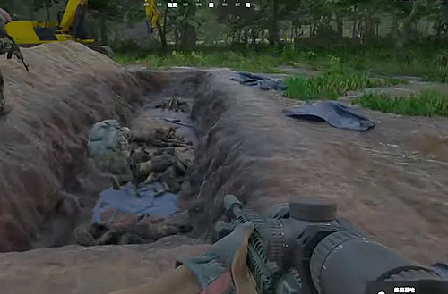3.トラックの更に南に見える黄色いショベルカーの所に行き、「集団墓地」を発見する。