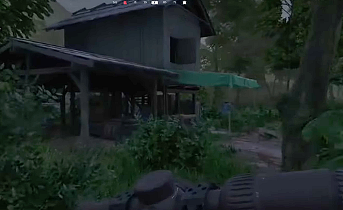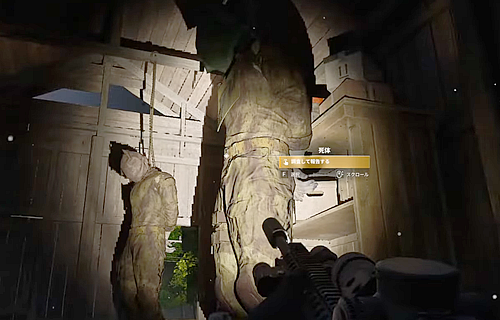 T字路の「交差点」のちょうど北側にある高床式住居の中に入り、吊るされている死体を調べる。
