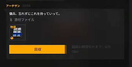 自分の倉庫に届けられるので、ベースキャンプか戦闘拠点で持ち出すのを忘れずに!
