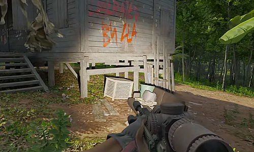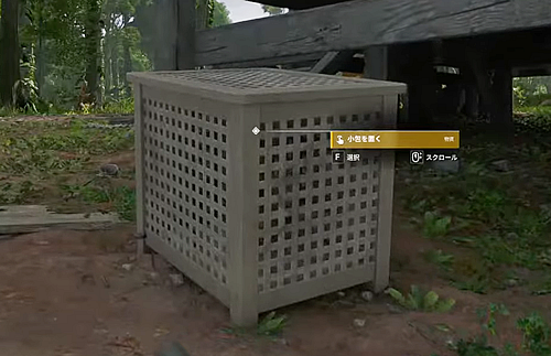 2.「古い小屋」の外のソファー横にある白いカゴを調べ、物資を入れる。