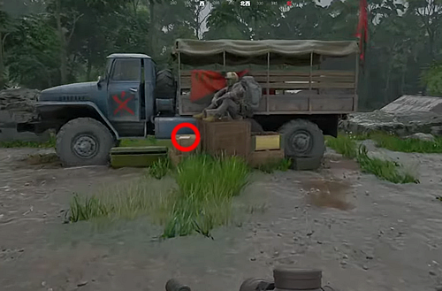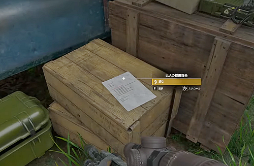 ・広場に停めてあるトラックの脇の木箱上にある書類「LLAの採用司令」