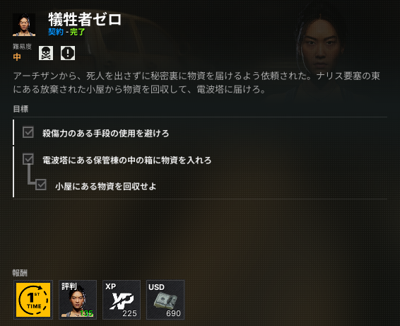 1.このタスクを受注したあと、敵を一人でも倒すとタスクが失敗となってしまうので注意。なので受注する前にまず目標地点の敵を倒してクリアリングしておくと安心。