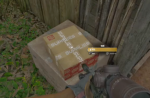 2.「即席の小屋」の横の箱の上に置かれている「物資」を取る。