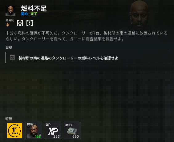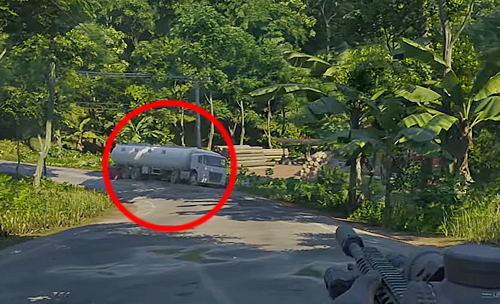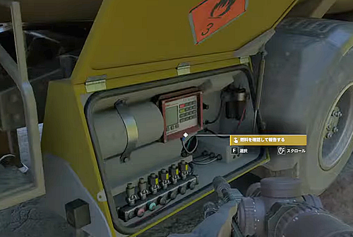 道路沿いに停められているタンクローリーの横に付いている燃料メーターを調べる。