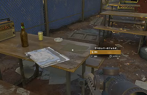2.南側のコンテナハウスの前あたりにある外のテーブルの上にある茶色いフォルダ「デベロッパーのフォルダ」を読む。