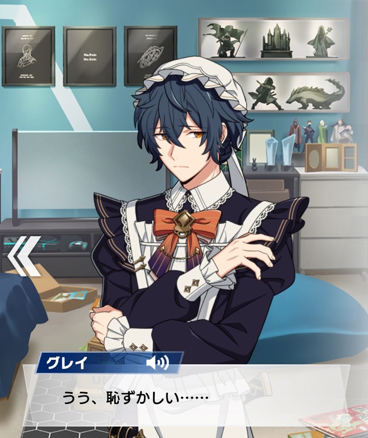 グレイ | うぅ、僕がこれを着たところで誰得なんだろう……けど、意外と動きやすいのは発見かも…… |