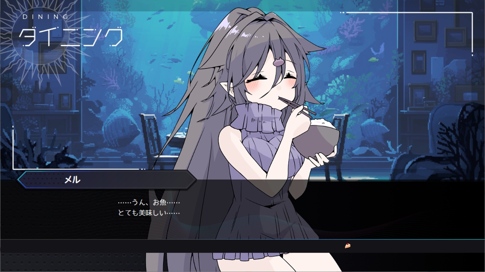 拠点メニューの「ダイニング」では、食事をすることで、減少しているメルの「満腹値」を回復させることができます。