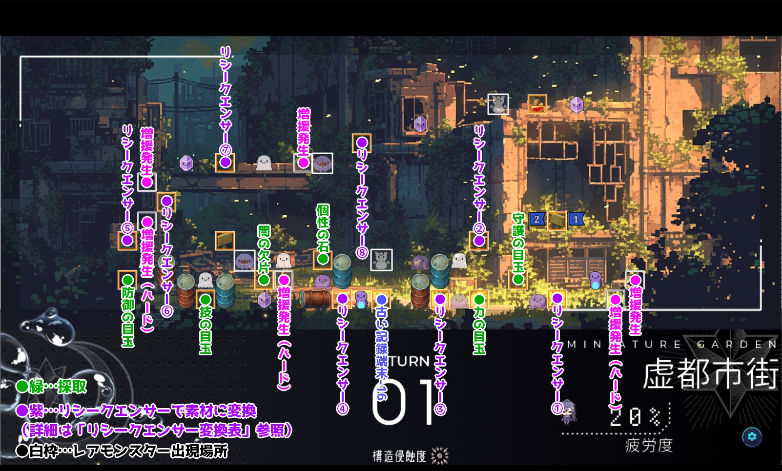 ・紫の遺灰 ●14ターン未満 ∟(幸運のお守り無し:30% 幸運のお守り有:50%) ●14ターン以降 ∟(幸運のお守り無し:60% 幸運のお守り有:100%) |